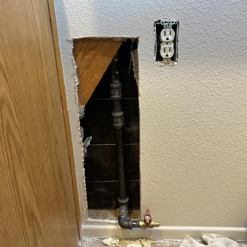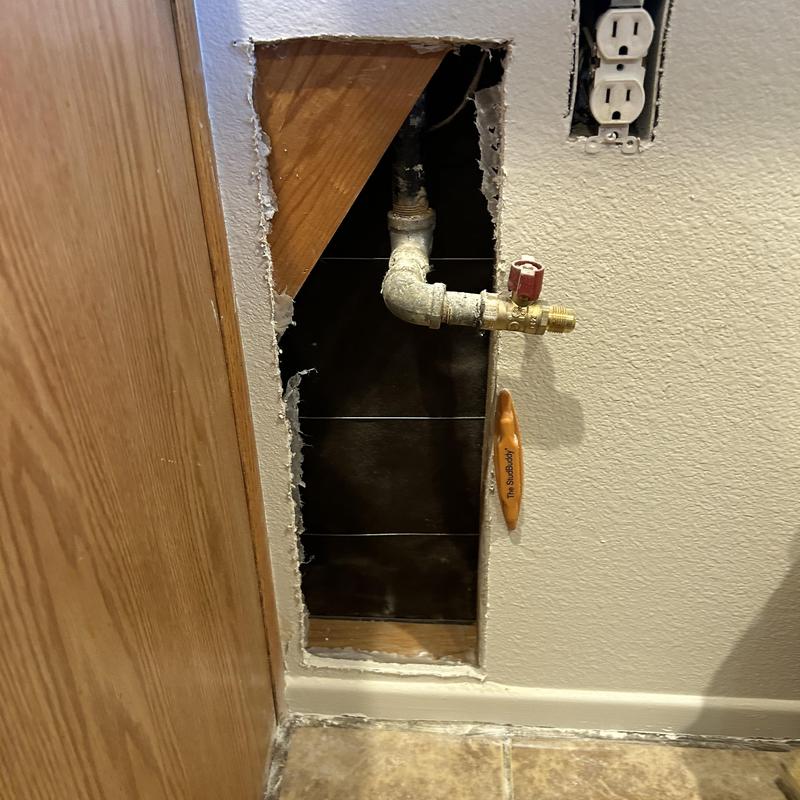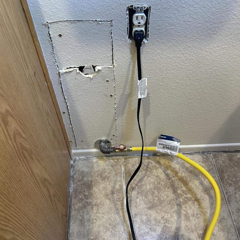Guillen Family Plumbing updated a kitchen gas line in Victorville, California. The team cut drywall, removed the old gas line, extended the line for the new range, installed a shut-off valve, and completed a gas pressure test to confirm no leaks.